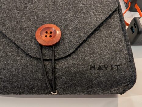 Havit STK011 to bardzo przemyślany zestaw podróżny zamknięty w eleganckim filcowym etui z dużym guzikiem jako zapięciem. Wygląda to naprawdę fajnie i nie zajmuje zbyt dużo miejsca, całość ma parę centymetrów grubości, a wielkością przypomina zeszyt w formacie A5. Na spokojnie wejdzie na bok plecaka, nawet przygotowanego pod restrykcyjne ograniczenia RyanAira czy Wizza.
